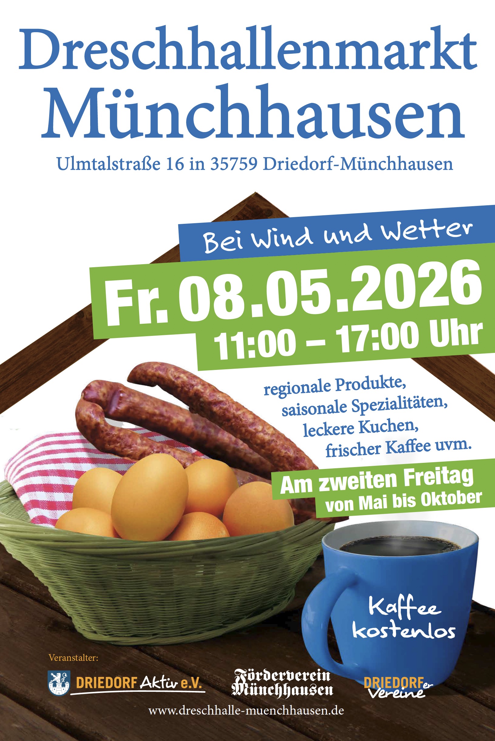 Zur Marktsaison 2026 lädt der beliebte, durch die LEADER-Region geförderte Bauernmarkt wieder in den Driedorfer Ortsteil-Münchhausen ein. Die Veranstaltung findet ab dem 8. Mai wie gewohnt an jedem 2. Freitag im Monat statt und wird von Driedorf Aktiv sowie dem Förderverein Münchhausen e.V. organisiert. Für die Bewirtung sorgen die Frauen der Ortsvereine. Von 11:00 bis 17:00 Uhr erwartet die Besucherinnen und Besucher eine vielfältige Auswahl direkt in und vor den Toren der alten Dreschhalle.